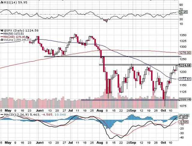 Máme za sebou klidný růstový týden, který skončil se ziskem téměř 6 %. Těžko uvěřit, že se ještě 4. října cena intradenně dostala na 1 070 a situace vypadala katastrofálně. 14.října, tedy po devíti obchodních dnech, je index S&P 500 na 1 220, čili o 14 % výše, a situace vypadá na další pokračování růstu. K začátku rally došlo při silně přeprodaném trhu. Tři dny skončily v červených číslech a více než 90 % akcií z indexu S&P 500 klesalo.