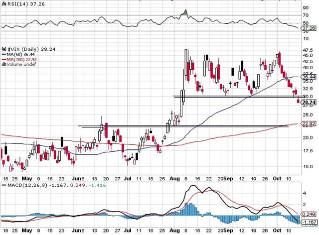 Index volatility VIX v pátek uzavřel pod hladinou 30, která byla silným supportem a od které se již třikrát odrazil k vysokým hodnotám. Naposledy VIX skončil obchodní den pod 30 ve středu 3. Srpna, od té doby jsme svědky ohromné volatility. Současný stav významně podporuje býčí sentiment a na VIXu se začíná stabilizovat klesající trend. V případě, že se vrátí do předchozího rozpětí a uzavře nad hodnotou 33, znamená to negativní signál pro býčí sentiment, který na akciích v současnosti je.