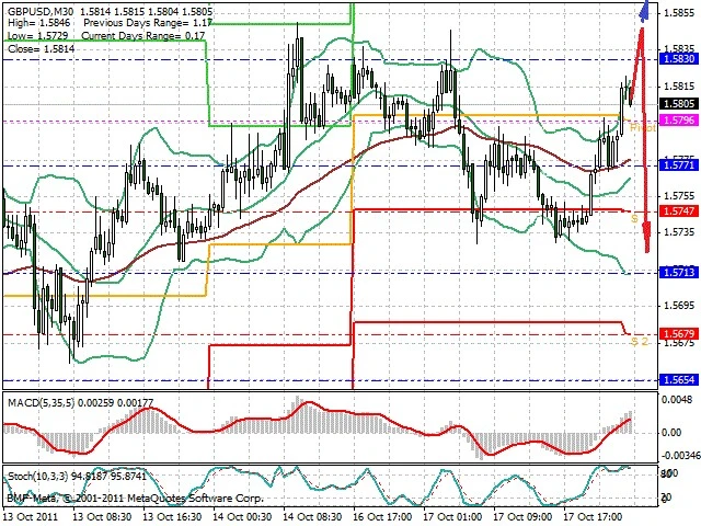 Předpokládaný pohyb pro dnešní den SHORT. Případné vstupy do obchodu z hladiny 1.5845 s předpokládaným cílem 1.572, případně až 1.567. Proražení hladiny 1.5855 může vést k pohybu s pravděpodobným cílem 1.591 až 1.5955.
