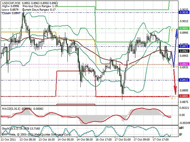Předpokládaný pohyb pro dnešní den LONG. Případné vstupy do obchodu z hladiny 0.8935 s předpokládaným cílem 0.9, případně až 0.9055. Proražení hladiny 0.8925 může vést k pohybu s pravděpodobným cílem 0.888 až 0.884.