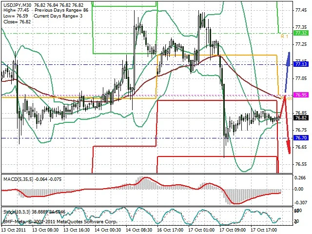 Předpokládaný pohyb pro dnešní den SHORT. Případné vstupy do obchodu z hladiny 76.95 s předpokládaným cílem 76.6, případně až 76.4. Proražení hladiny 77 může vést k pohybu s pravděpodobným cílem 77.2 až 77.5.