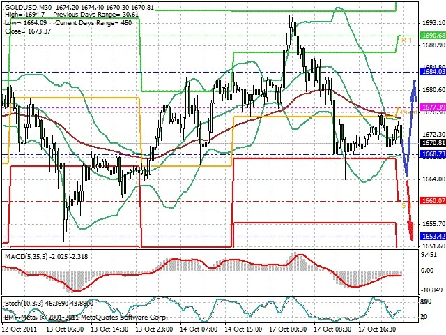 Předpokládaný pohyb pro dnešní den LONG. Případné vstupy do obchodu z hladiny 1 665 s předpokládaným cílem 1 683, případně až 1 695. Proražení hladiny 1 665 může vést k pohybu s pravděpodobným cílem 1 653 až 1 646.