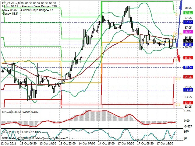Předpokládaný pohyb pro dnešní den LONG. Případné vstupy do obchodu z hladiny 86.1 s předpokládaným cílem 88.4 případně až 89.85. Proražení hladiny 86.1 může vést k pohybu s pravděpodobným cílem 85.5 až 85.