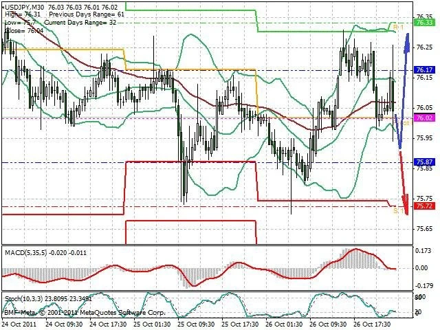 Předpokládaný pohyb pro dnešní den LONG. Případné vstupy do obchodu z hladiny 75.9 s předpokládaným cílem 76.3, případně až 76.5. Proražení hladiny 75.9 může vést k pohybu s pravděpodobným cílem 75.7 až 75.4.