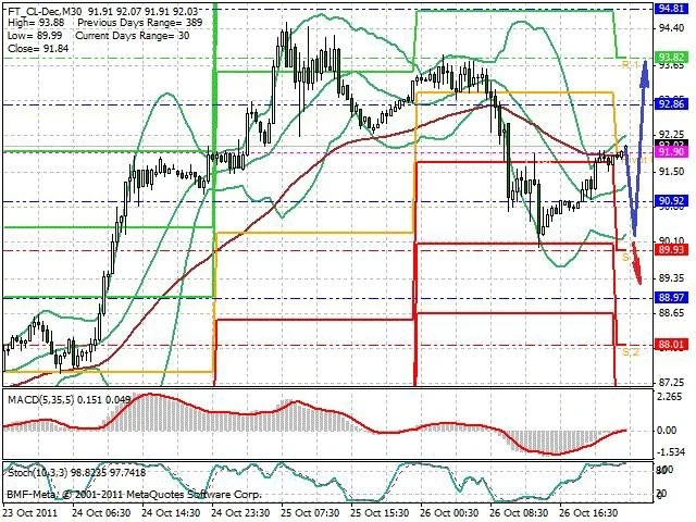 Předpokládaný pohyb pro dnešní den LONG. Případné vstupy do obchodu z hladiny 90.2 s předpokládaným cílem 93.75 případně až 94.65. Proražení hladiny 90.2 může vést k pohybu s pravděpodobným cílem 89.4 až 88.2.