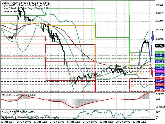 Předpokládaný pohyb pro dnešní den LONG. Případné vstupy do obchodu z hladiny 0.865 s předpokládaným cílem 0.877, případně až 0.88. Proražení hladiny 0.865 může vést k pohybu s pravděpodobným cílem 0.8605 až 0.8565.