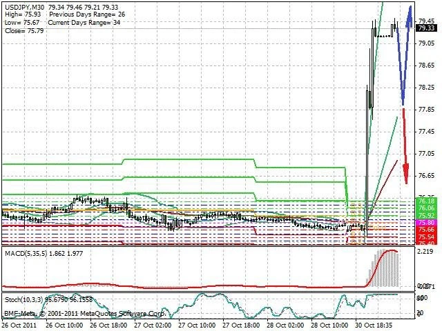 Předpokládaný pohyb pro dnešní den LONG. Případné vstupy do obchodu z hladiny 77.9 s předpokládaným cílem 79.6, případně až 80.1. Proražení hladiny 77.9 může vést k pohybu s pravděpodobným cílem 77.2 až 76.5.