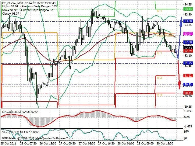 Předpokládaný pohyb pro dnešní den LONG. Případné vstupy do obchodu z hladiny 92 s předpokládaným cílem 93.75 případně až 94.65. Proražení hladiny 92 může vést k pohybu s pravděpodobným cílem 90.65 až 90.