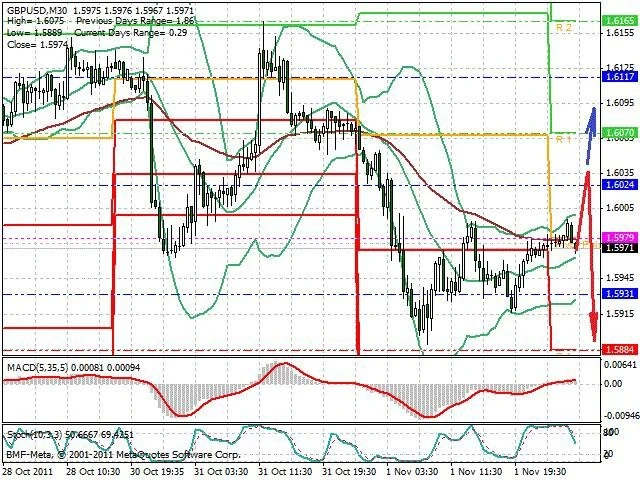 Předpokládaný pohyb pro dnešní den SHORT. Případné vstupy do obchodu z hladiny 1.6035 s předpokládaným cílem 1.589, případně až 1.582. Proražení hladiny 1.6035 může vést k pohybu s pravděpodobným cílem 1.609 až 1.615.