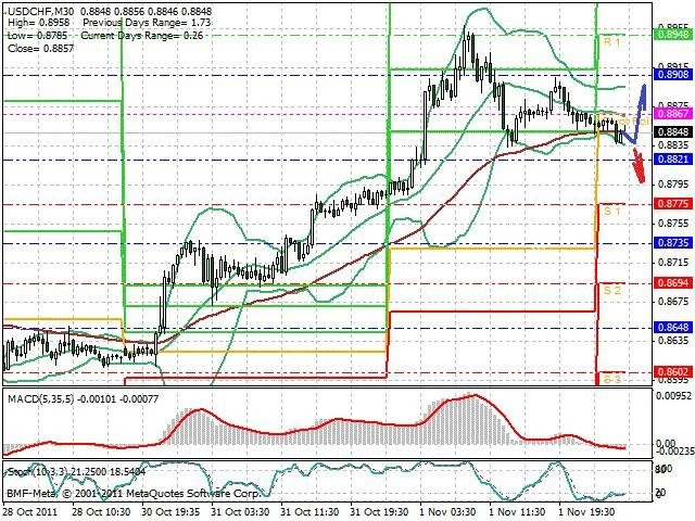 Předpokládaný pohyb pro dnešní den LONG. Případné vstupy do obchodu z hladiny 0.884 s předpokládaným cílem 0.891, případně až 0.896. Proražení hladiny 0.884 může vést k pohybu s pravděpodobným cílem 0.88 až 0.873.