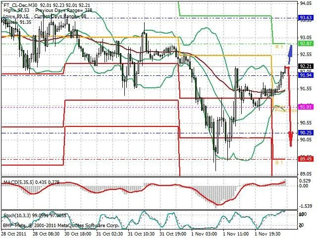 Předpokládaný pohyb pro dnešní den SHORT. Případné vstupy do obchodu z hladiny 92.25 s předpokládaným cílem 90 případně až 89.45. Proražení hladiny 92.25 může vést k pohybu s pravděpodobným cílem 92.85 až 93.85.