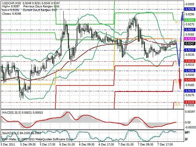 Předpokládaný pohyb pro dnešní den LONG. Případné vstupy do obchodu z hladiny 0.9215 s předpokládaným cílem 0.9295, případně až 0.933. Proražení hladiny 0.9215 může vést k pohybu s pravděpodobným cílem 0.918 až 0.914.
