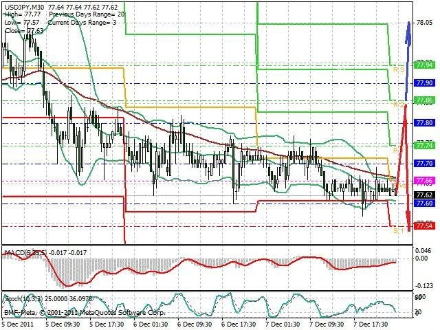 Předpokládaný pohyb pro dnešní den SHORT. Případné vstupy do obchodu z hladiny 77.85 s předpokládaným cílem 77.53, případně až 77.26. Proražení hladiny 77.85 může vést k pohybu s pravděpodobným cílem 78.05 až 78.3.