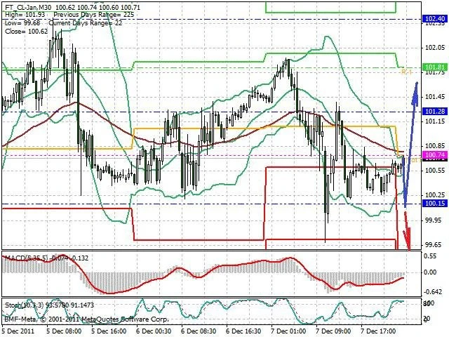 Předpokládaný pohyb pro dnešní den LONG. Případné vstupy do obchodu z hladiny 100 s předpokládaným cílem 101.6 případně až 102.4. Proražení hladiny 100 může vést k pohybu s pravděpodobným cílem 98.9 až 98.