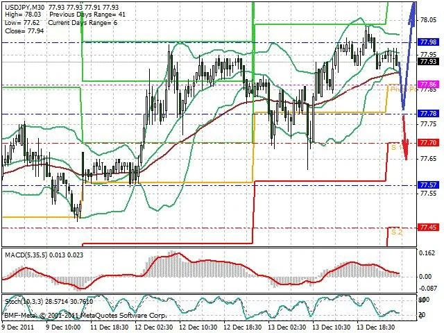 Předpokládaný pohyb pro dnešní den LONG. Případné vstupy do obchodu z hladiny 77.8 s předpokládaným cílem 78.1, případně až 78.15. Proražení hladiny 77.8 může vést k pohybu s pravděpodobným cílem 77.65 až 77.45.