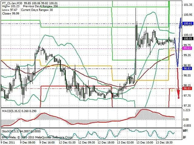 Předpokládaný pohyb pro dnešní den LONG. Případné vstupy do obchodu z hladiny 98.9 s předpokládaným cílem 100.8 případně až 101.2. Proražení hladiny 98.9 může vést k pohybu s pravděpodobným cílem 97.7 až 97.3.