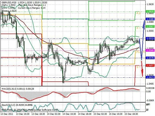 Předpokládaný pohyb pro dnešní den LONG. Případné vstupy do obchodu z hladiny 1.547 s předpokládaným cílem 1.5585, případně až 1.5625. Proražení hladiny 1.547 může vést k pohybu s pravděpodobným cílem 1.543 až 1.5405.