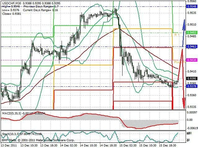 Předpokládaný pohyb pro dnešní den SHORT. Případné vstupy do obchodu z hladiny 0.946 s předpokládaným cílem 0.9335, případně až 0.929. Proražení hladiny 0.946 může vést k pohybu s pravděpodobným cílem 0.9515 až 0.9555.