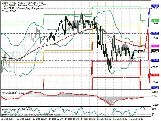 Předpokládaný pohyb pro dnešní den SHORT. Případné vstupy do obchodu z hladiny 78 s předpokládaným cílem 77.65, případně až 77.45. Proražení hladiny 78 může vést k pohybu s pravděpodobným cílem 78.15 až 78.35.