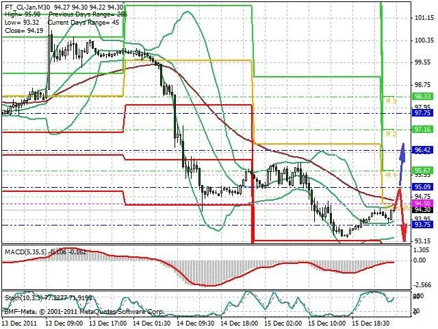 Předpokládaný pohyb pro dnešní den SHORT. Případné vstupy do obchodu z hladiny 95 s předpokládaným cílem 93.3 případně až 92.5. Proražení hladiny 95 může vést k pohybu s pravděpodobným cílem 96.5 až 97.6.