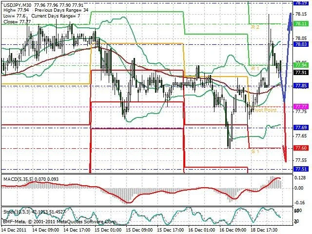 Předpokládaný pohyb pro dnešní den LONG. Případné vstupy do obchodu z hladiny 77.8 s předpokládaným cílem 78.15, případně až 78.35. Proražení hladiny 77.8 může vést k pohybu s pravděpodobným cílem 77.55 až 77.45.