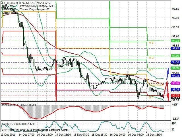 Předpokládaný pohyb pro dnešní den SHORT. Případné vstupy do obchodu z hladiny 93.85 s předpokládaným cílem 92.3 případně až 91.8. Proražení hladiny 93.85 může vést k pohybu s pravděpodobným cílem 94.9 až 95.35.