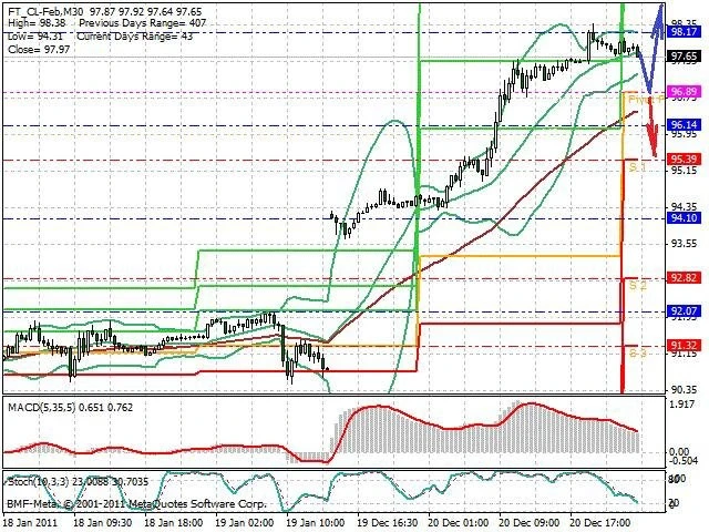 Předpokládaný pohyb pro dnešní den LONG. Případné vstupy do obchodu z hladiny 96.82 s předpokládaným cílem 98.6 případně až 99.8. Proražení hladiny 96.82 může vést k pohybu s pravděpodobným cílem 95.45 až 94.9.