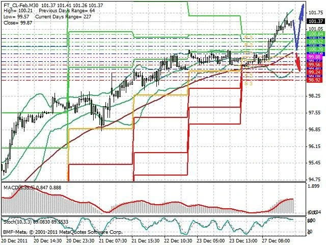 Předpokládaný pohyb pro dnešní den LONG. Případné vstupy do obchodu z hladiny 100.2 s předpokládaným cílem 102 případně až 102.5. Proražení hladiny 100.2 může vést k pohybu s pravděpodobným cílem 99.35 až 98.55.