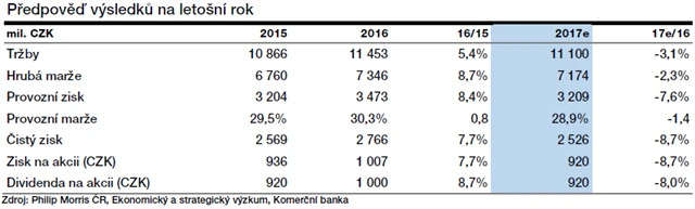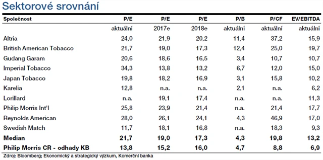 "Pro ocenění akcií Philip Morris ČR jsme použili model diskontovaných dividend, kde jsme diskontovali očekávané dividendy z let 2017-2026 (vyplácené 2018-2027). Získanou fair value (vnitřní hodnotu) 13 110 Kč za akcii jsme upravili o vyšší atraktivitu sektoru a spekulativní potenciál, což bylo částečně kompenzováno nižší atraktivitou firmy jako takové," doplňuje analytik.