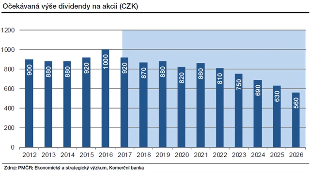 Z loňského zisku společnost vyplatí dividendu 1 000 Kč na akcii, což je oproti minulé výplatě nárůst o 80 Kč. V dlouhodobém horizontu by však vlivem pokračujícího trendu klesajících marží mělo docházet i ke snižování celkového čistého zisku s negativním dopadem na vyplácené dividendy.