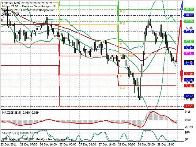 Předpokládaný pohyb pro dnešní den SHORT. Případné vstupy do obchodu z hladiny 78 s předpokládaným cílem 77.65, případně až 77.5. Proražení hladiny 78 může vést k pohybu s pravděpodobným cílem 78.1 až 78.2.