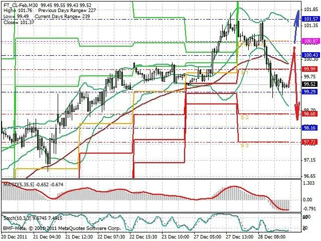 Předpokládaný pohyb pro dnešní den SHORT. Případné vstupy do obchodu z hladiny 100.65 s předpokládaným cílem 98.55 případně až 98. Proražení hladiny 100.65 může vést k pohybu s pravděpodobným cílem 101.75 až 102.5.