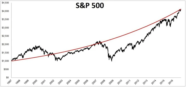 S&P 500 - skutečný vývoj vs. průměrné roční zhodnocení (1997-2017)