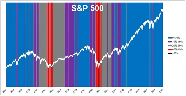 Od roku 1997 se tisíc dolarů vložených do S&P 500 zhodnotilo na současných asi 4 100 USD, investoři ale mezitím prožili nespočet bezesných nocí, ale také nespočetněkrát zakusili, co je to euforie. Ceny akcií rozhodně jen nerostou. Následující graf ukazuje, kolik americké akcie v různých chvílích ztrácely na svá poslední lokální maxima.