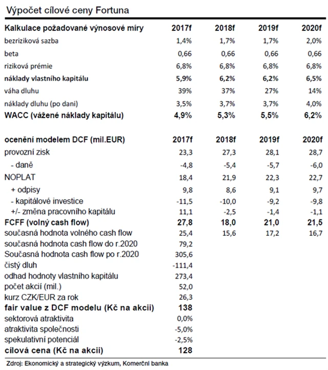 "Navzdory relativně malé informační vstřícnosti společnosti ohledně zmiňovaných akvizic jsme se ve svých modelech a prognózách pokusili zohlednit všechny dostupné informace o akvírovaných společnostech a určit jejich vliv na cílovou cenu akcií společnosti Fortuna. Výrazný nárůst ziskovosti významně podpořil zvýšení cílové ceny," uvedl analytik z Komerční banky. "Pozitivně na cílovou cenu působilo i mírné snížení průměrné ceny kapitálu WACC díky nárůstu dluhu, jehož náklady jsou nižší než náklady vlastního kapitálu, snížení rizikové přirážky, faktoru beta a bezrizikové sazby. Po zohlednění zmíněných vlivů stanovujeme roční cílovou cenu na 128 Kč za akcii, která je výrazně nad původní nabízenou odkupní cenou 98,04 Kč a indikuje, že i zvýšená odkupní cena 118,04 Kč je pod námi odhadovanou budoucí hodnotou společnosti."