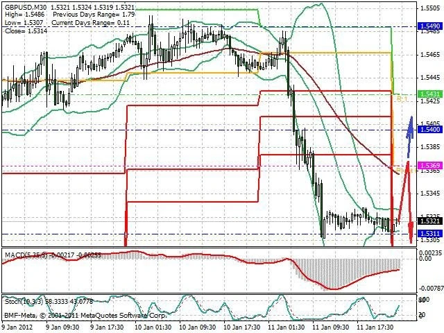 Předpokládaný pohyb pro dnešní den SHORT. Případné vstupy do obchodu z hladiny 1.537 s předpokládaným cílem 1.53, případně až 1.527. Proražení hladiny 1.537 může vést k pohybu s pravděpodobným cílem 1.541 až 1.544.