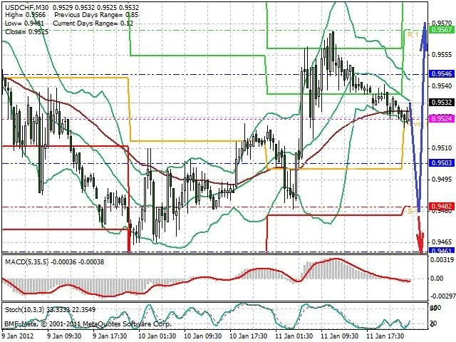Předpokládaný pohyb pro dnešní den LONG. Případné vstupy do obchodu z hladiny 0.948 s předpokládaným cílem 0.957, případně až 0.9595. Proražení hladiny 0.948 může vést k pohybu s pravděpodobným cílem 0.946 až 0.943.