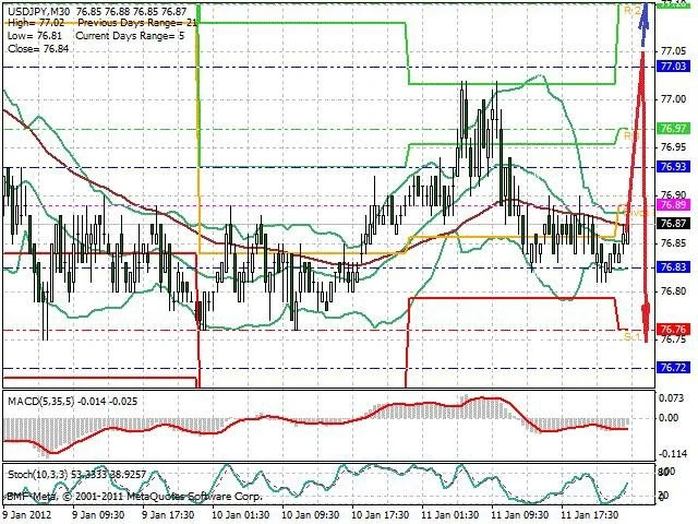 Předpokládaný pohyb pro dnešní den SHORT. Případné vstupy do obchodu z hladiny 77.05 s předpokládaným cílem 76.75, případně až 76.55. Proražení hladiny 77.05 může vést k pohybu s pravděpodobným cílem 77.25 až 77.45
