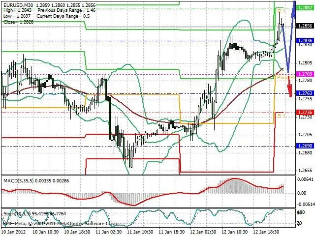 Předpokládaný pohyb pro dnešní den LONG. Případné vstupy do obchodu z hladiny 1.279 s předpokládaným cílem 1.29, případně až 1.294. Proražení hladiny 1.279 může vést k pohybu s pravděpodobným cílem 1.276 až 1.2725.