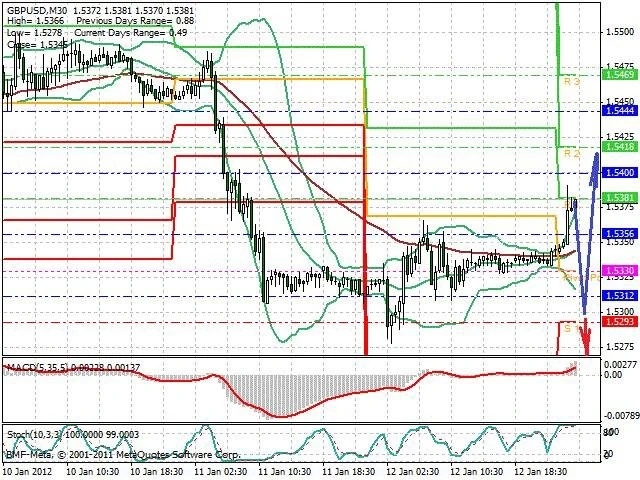 Předpokládaný pohyb pro dnešní den LONG. Případné vstupy do obchodu z hladiny 1.5305 s předpokládaným cílem 1.541, případně až 1.544. Proražení hladiny 1.5305 může vést k pohybu s pravděpodobným cílem 1.527 až 1.525.