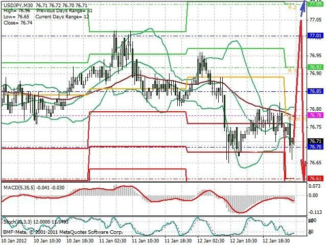 Předpokládaný pohyb pro dnešní den SHORT. Případné vstupy do obchodu z hladiny 77.05 s předpokládaným cílem 76.55, případně až 76.35. Proražení hladiny 77.05 může vést k pohybu s pravděpodobným cílem 77.25 až 77.45.