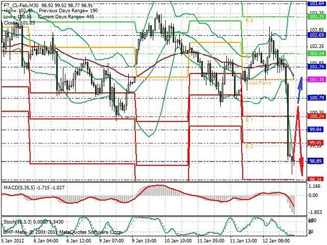 Předpokládaný pohyb pro dnešní den SHORT. Případné vstupy do obchodu z hladiny 100.55 s předpokládaným cílem 98.5 případně až 97.55. Proražení hladiny 100.55 může vést k pohybu s pravděpodobným cílem 101.3 až 102.05.
