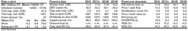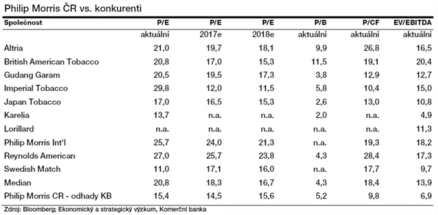"Rostoucí tržby z výrobních služeb podle nás podpoří nárůst ziskovosti Philip Morris ČR natolik, že udrží vysokou úroveň dividendy i v následujících letech. Odhad dividendy za rok 2017 jsme zvýšili z 920 na 1 070 korun na akcii. Díky zvýšeným dividendám odhadujeme růst ceny akcií v horizontu následujících dvanácti měsíců na 17 546 korun. To představuje potenciál zhodnocení přes 20 %, což odpovídá nákupnímu doporučení," napsal Miřátský.
