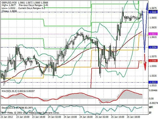 Předpokládaný pohyb pro dnešní den LONG. Případné vstupy do obchodu z hladiny 1.5585 s předpokládaným cílem 1.57, případně až 1.5735. Proražení hladiny 1.5585 může vést k pohybu s pravděpodobným cílem 1.555 až 1.551.