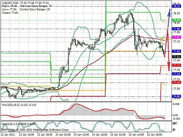 Předpokládaný pohyb pro dnešní den SHORT. Případné vstupy do obchodu z hladiny 77.95 s předpokládaným cílem 77.55, případně až 77.3. Proražení hladiny 77.95 může vést k pohybu s pravděpodobným cílem 78.25 až 78.5.
