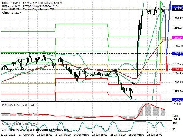 Předpokládaný pohyb pro dnešní den LONG. Případné vstupy do obchodu z hladiny 1 680 s předpokládaným cílem 1 720, případně až 1 738. Proražení hladiny 1 680 může vést k pohybu s pravděpodobným cílem 1 669 až 1 650.