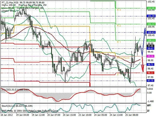 Předpokládaný pohyb pro dnešní den LONG. Případné vstupy do obchodu z hladiny 99.25 s předpokládaným cílem 100.9 případně až 101.75. Proražení hladiny 99.25 může vést k pohybu s pravděpodobným cílem 98.25 až 97.5.
