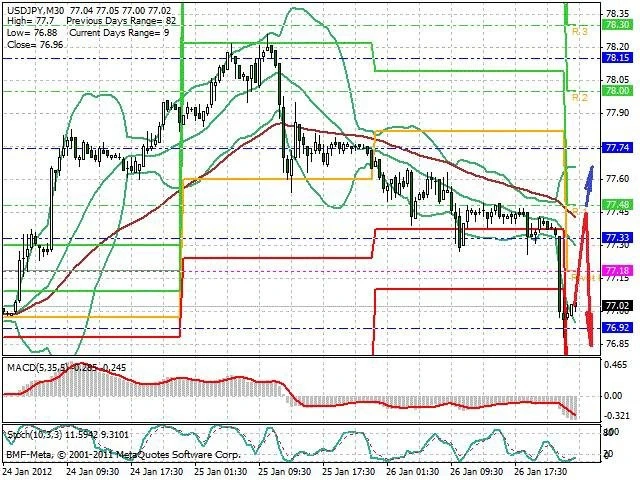 Předpokládaný pohyb pro dnešní den SHORT. Případné vstupy do obchodu z hladiny 77.45 s předpokládaným cílem 76.85, případně až 76.65. Proražení hladiny 77.45 může vést k pohybu s pravděpodobným cílem 77.65 až 77.85.