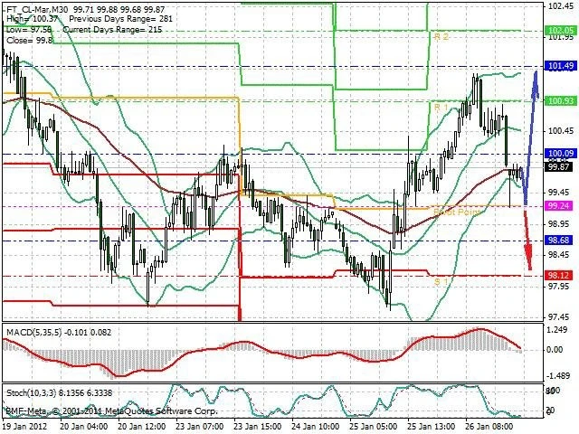 Předpokládaný pohyb pro dnešní den LONG. Případné vstupy do obchodu z hladiny 99.25 s předpokládaným cílem 101.35 případně až 101.75. Proražení hladiny 99.25 může vést k pohybu s pravděpodobným cílem 98.25 až 97.5.