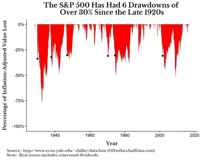 Proč? Začněme grafem propadů akciového indexu S&P 500 od roku 1920. Výrazných poklesů byla řada, vyznačené jsou pouze propady o minimálně 30 % z historického maxima. Od roku 1920 trh zažil 30% pokles 6krát (poslední medvědí trend po roce 2007 není označen, protože od roku 2000 nedošlo k překonání historického maxima, černé tečky označují měsíc, kdy došlo k prvnímu propadu o 30 % z historického rekordu), propady o více než 40 % byly čtyři a ve třech případech trhy ztratily více než 50 %. Tolik ke krvi v ulicích.